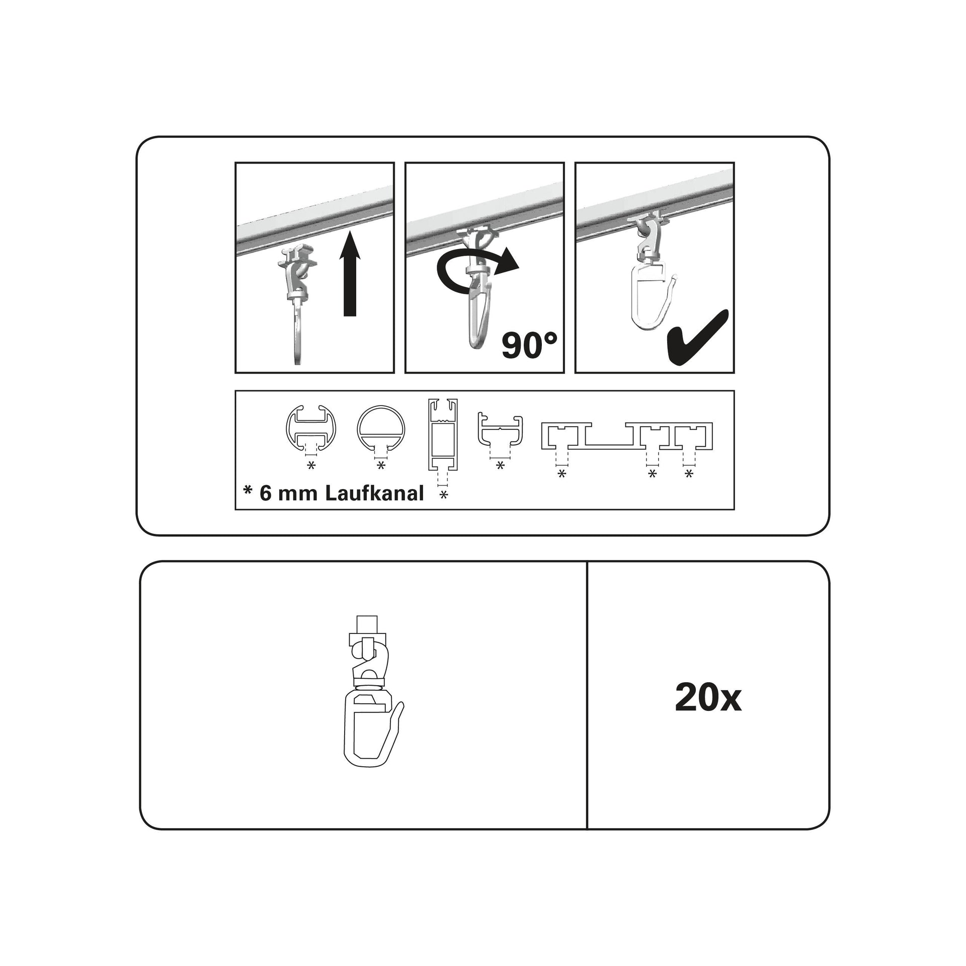 Polioximetilenă, cu cârlig pentru falduri, pentru șinele de perdea și profilele de culisare cu canal de culisare 6 mm. Pot fi folosiți pentru profile de culisare I cu Ø 16, 20 sau 25mm și pentru profile de culisare II cu Ø 19 sau 20mm.20x buc