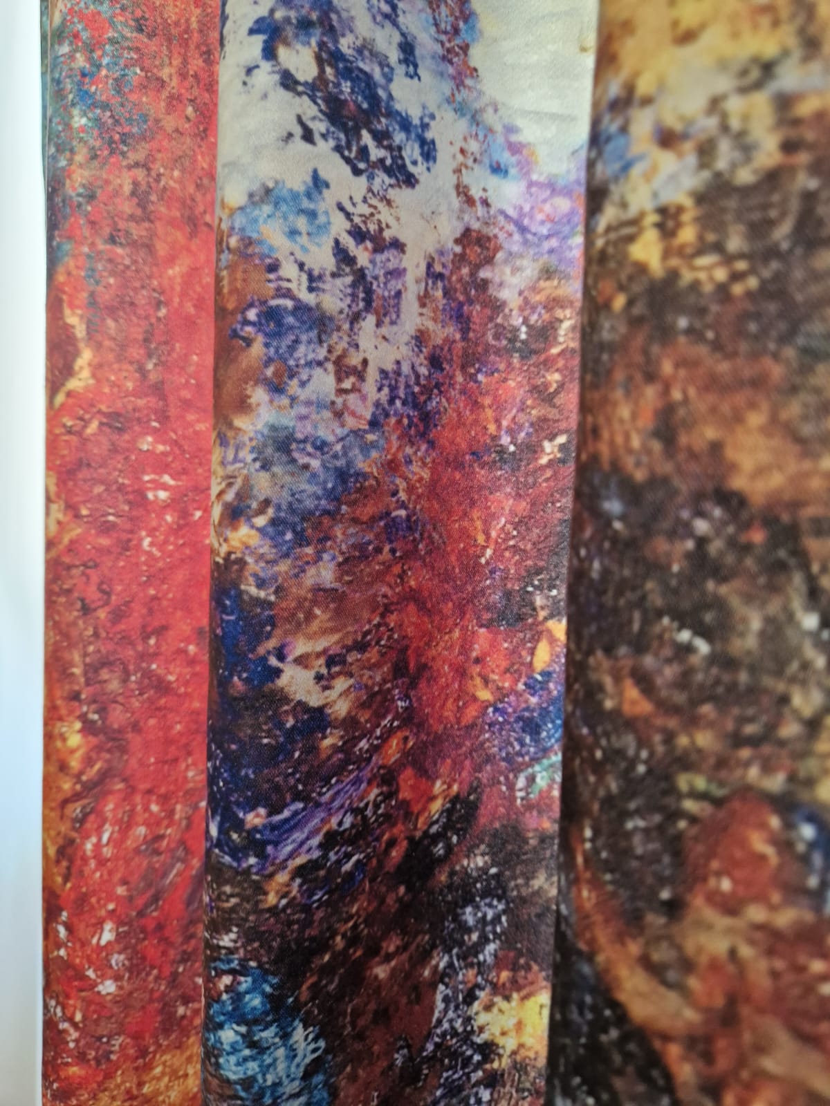 Draperia Costa Rica 01, tip dimout, model abstract multicolor, cu o lățime 1,50 m este o piesă decorativă spectaculoasă.