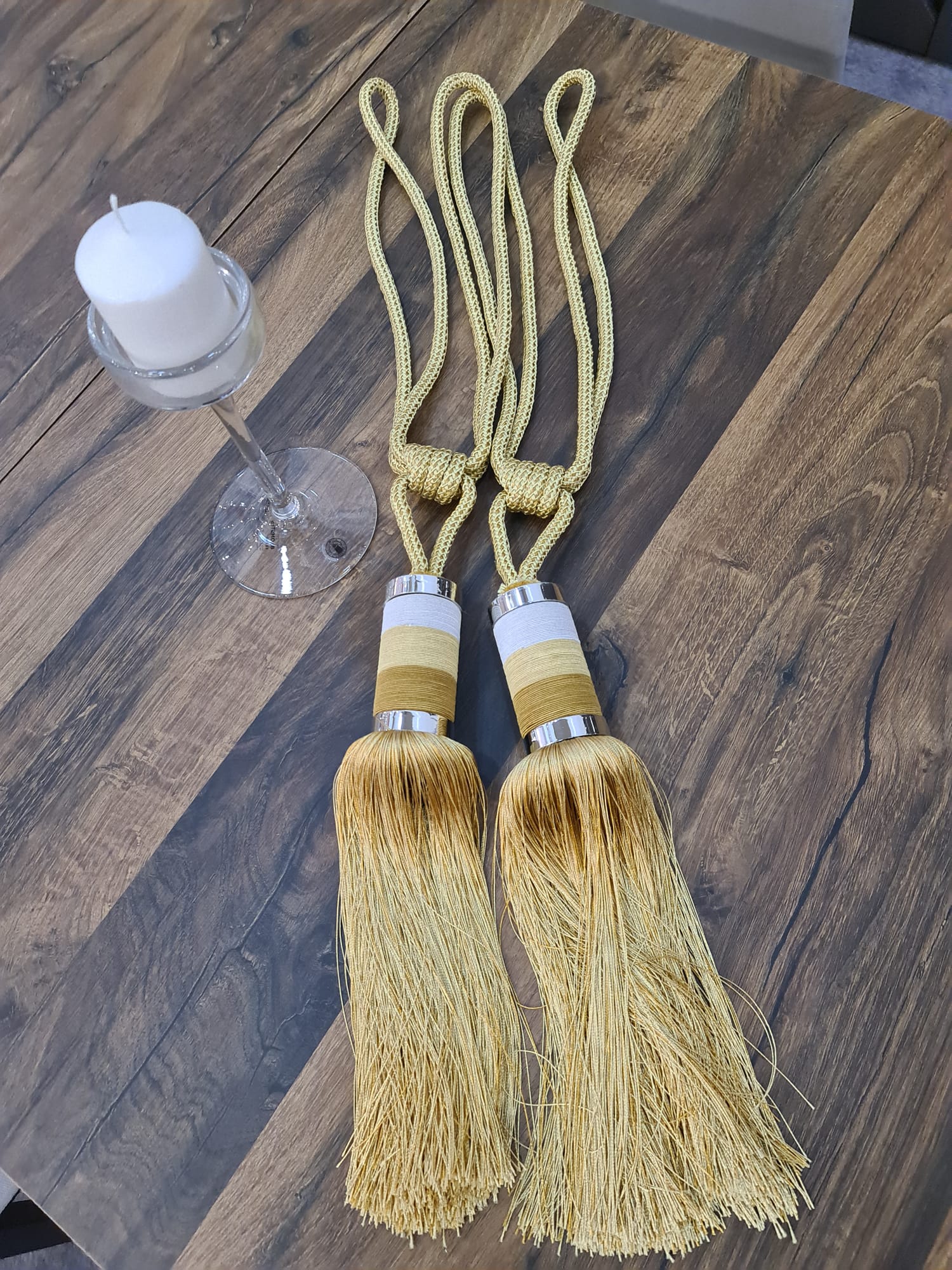 - Product name: Canaf Gold, decorative tassel with cord for curtains and drapes, yellow, white and cream, in gradients, 80 cm ;