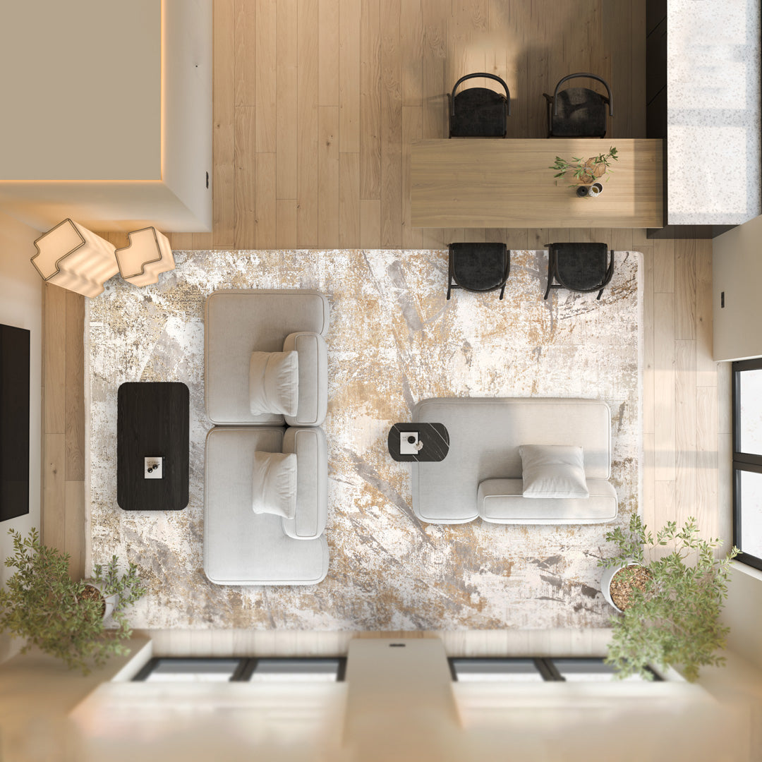 The Aspendos Ethereal Gilded rug features a non-figurative pattern inspired by ephemeral sands.