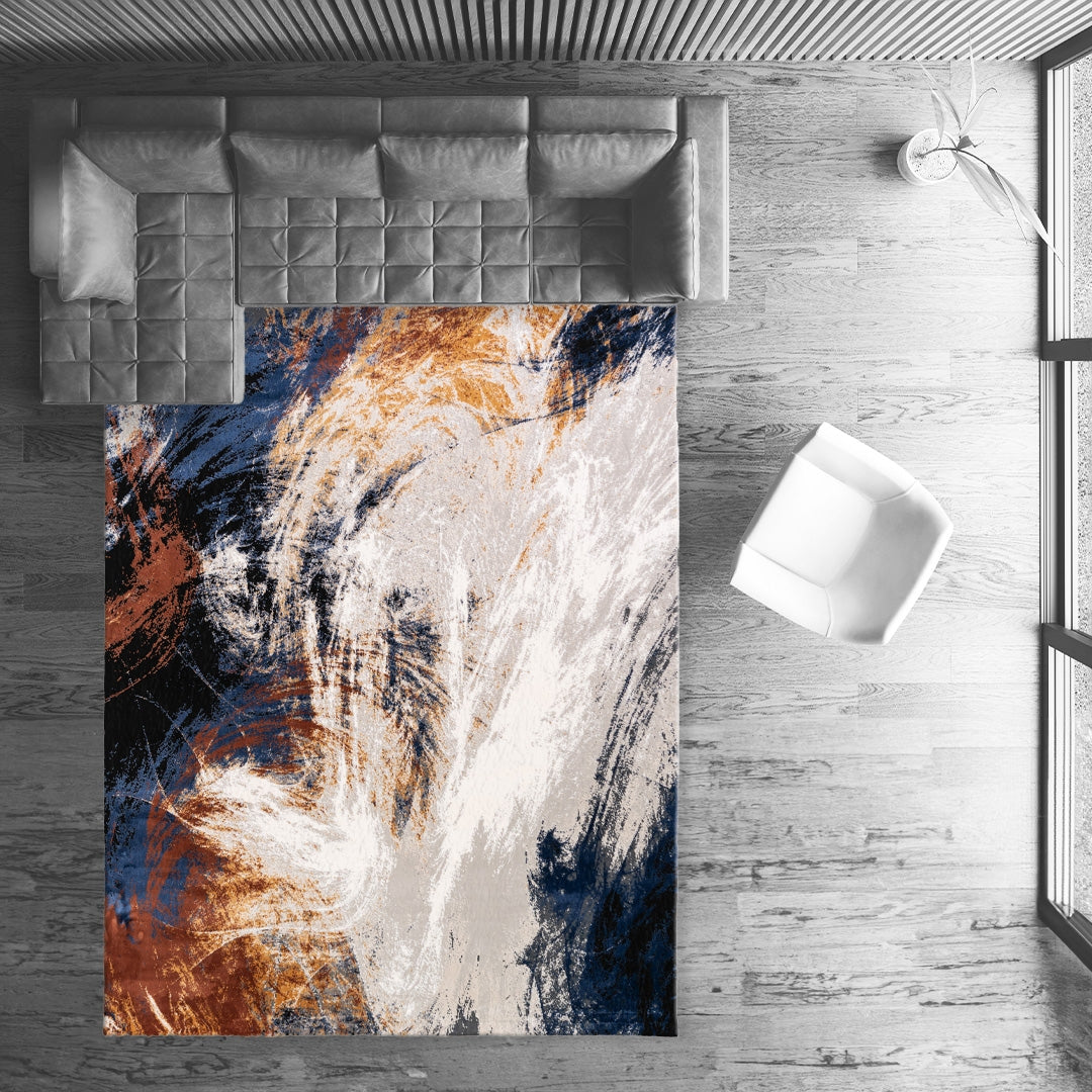 The "BOMBAI Abstract Ink" rug exudes mystery and creativity, with inky hues and elegant abstract shapes, bringing a distinctive touch to any room.