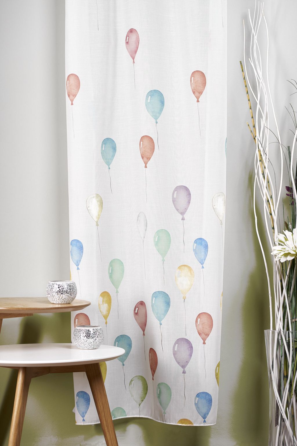 The exclusive model curtain 534 CVK 3322/01, made of natural linen, white, with a print of colorful balloons, is easy to maintain and clean, resistant to multiple washings.