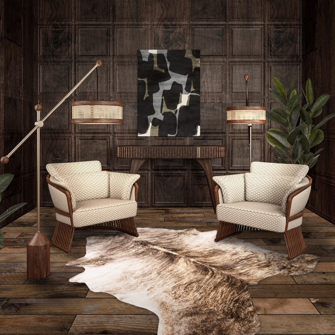 The BOVINA Whispering Shadows rug is a masterpiece of elegance and mystery, made of the highest quality natural fur. With an abstract design that evokes dancing and mysterious shadows, this rug brings an atmosphere of enigma and refinement to the room. The rich and warm tones of autumn intertwine harmoniously, emanating a feeling full of warmth and intimacy. With a soft texture and fine details, this rug becomes not only a decorative piece, but also a source of comfort and relaxation in any room.