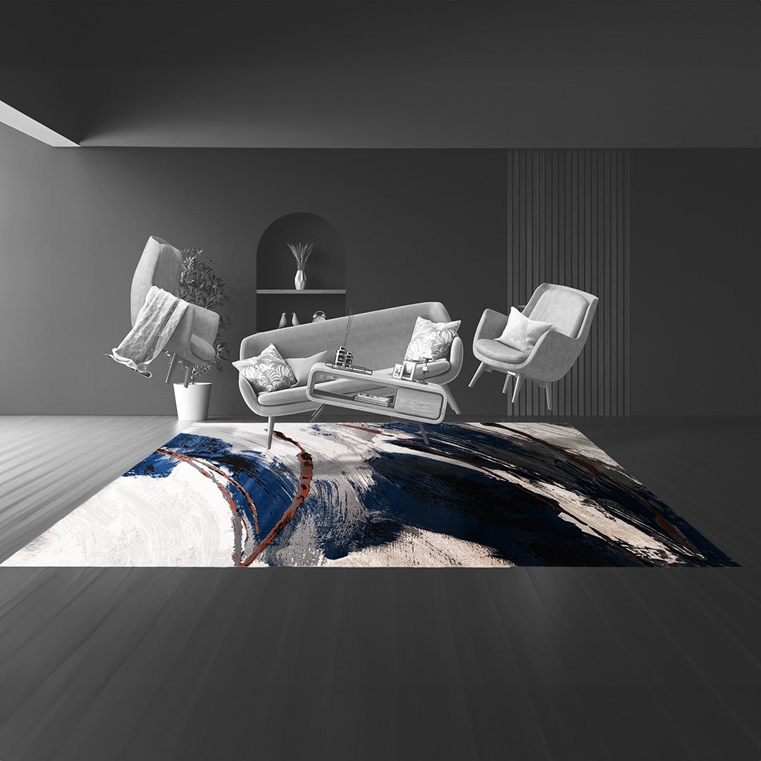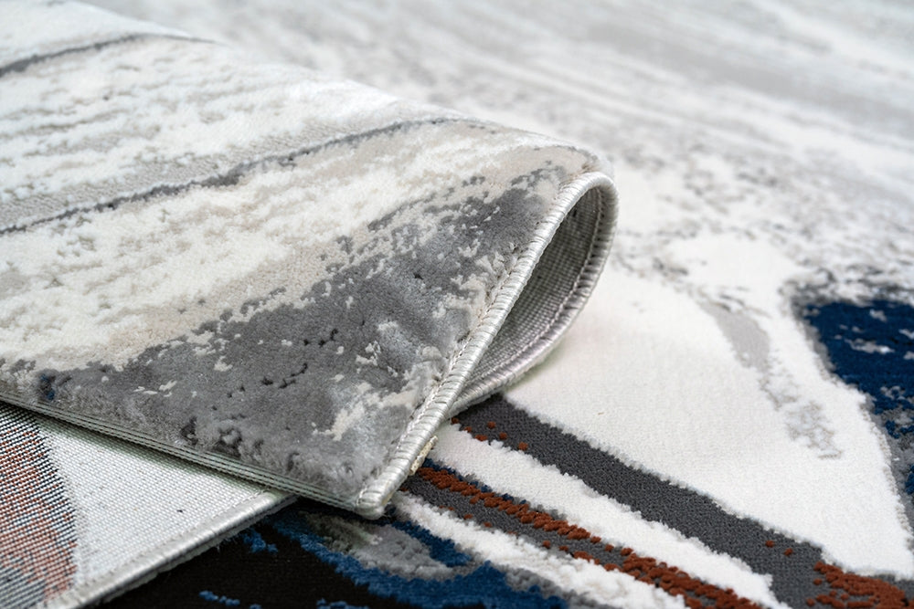 Covorul din colecția BOMBAI impresionează cu dungi delicate de pensulă în alb și albastru, cu accente ciocolatii, creând o atmosferă calmă și elegantă în interior. Acest design subtil emană o notă artistică și se potrivește perfect într-un decor în stil nordic. Cu combinația sa de culori rafinate și textura moale, covorul devine un punct de atracție, aducând o senzație plăcută de confort și relaxare în orice încăpere.