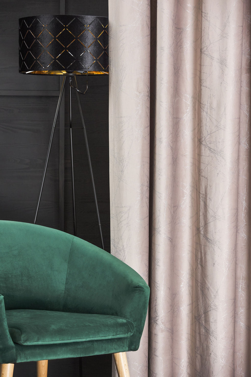 Design-ul Draperiei Ruben 04, catifea, grej cu inserții argintii este unul subtil, motiv pentru care se pretează aproape oricărui design interior folosit;
