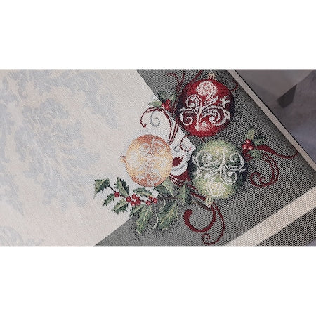 Accentele strălucitoare, fondul alb-argintiu și modelul țesut, cu globulețe și crengi de vâsc, aduc un farmec aparte mesei festive.